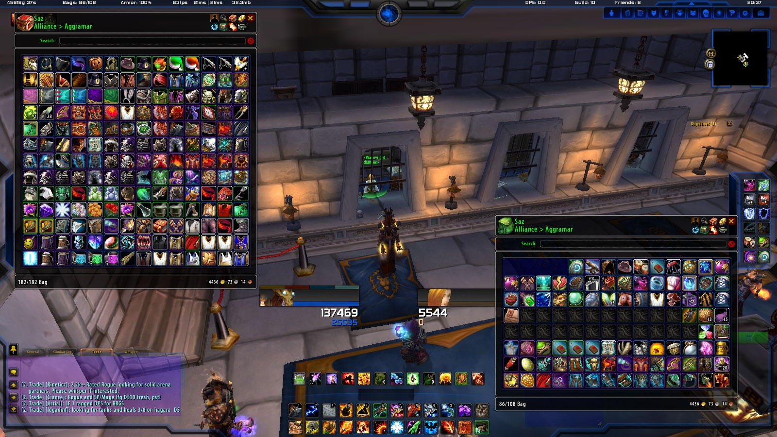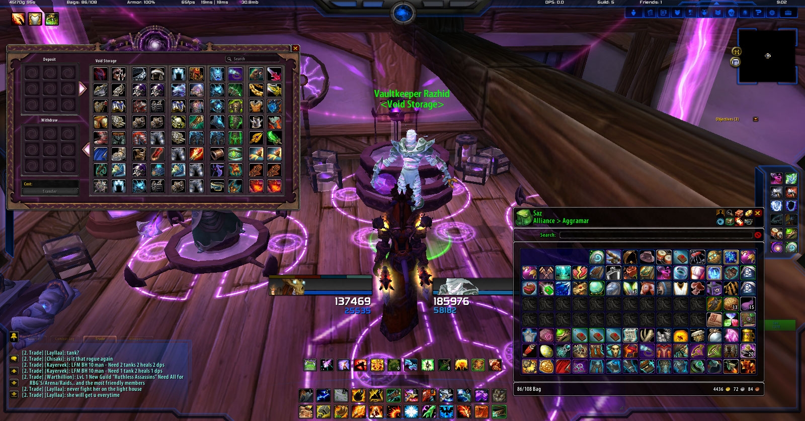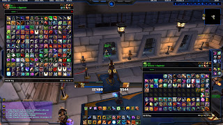 As you may notice, my personal bank is rather large and completely full to the brim. Likewise my personal bag space is still a bit limited despite its size, but it is no where near as full as it was prior to patch 4.3. Thanks to the implementation of the new interface feature called Void Storage I now have more than two to three slots available at any given time. (Please note that this is what my personal inventory looks like on a non-raid night; what you don't see in this image are the several stacks of food, flasks, and potions that are more or less a requirement for a raider seeking to push progression content that I typically tote around several nights of the week.)